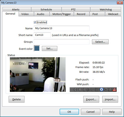 La ventana de propiedades de la cámara es realmente once ventanas en una. Permite configurar una gran cantidad de funciones para cada cámara individual de su sistema. Cada ventana tiene su propia "pestaña": General, Vídeo (Video), Audio, Movimiento/Disparo (Motion/Trigger), Grabación (Record), Post, Publicación Web (Webcast), Alertas (Alerts), Programación (Schedule), Movimiento (PTZ) e Inactividad (Watchdog).