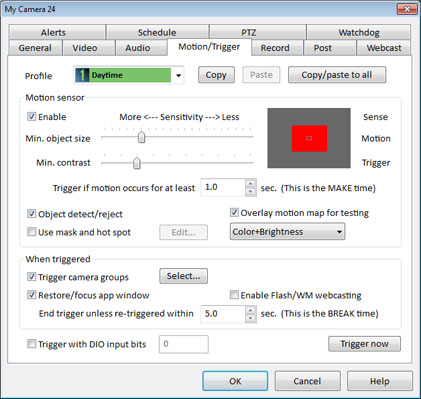 Propiedades de la cámara - Motion/trigger
