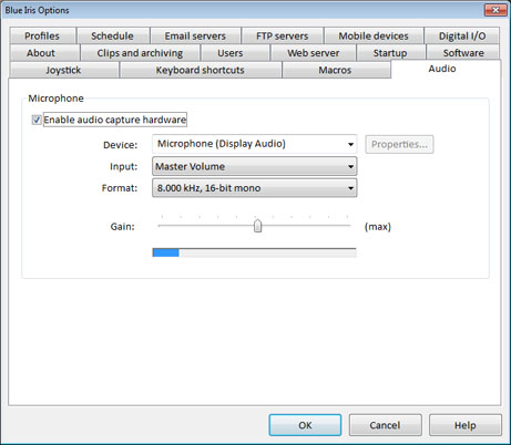 Esta pestaña le permite configurar el micrófono que será usado para la función Hablar (Talk) de la cámara, en los casos en que disponga de esa función y Blue Iris la soporte.
