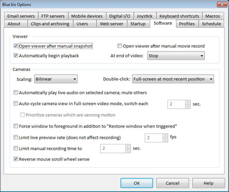 Las opciones evitar que se active el salvapantallas (prevent the Windows screensavee) y Evitar que se aplique la gestión de energía (Prevent Power Management) le permiten ignorar estas características de Windows que pueden interferir con su uso de Blue Iris.