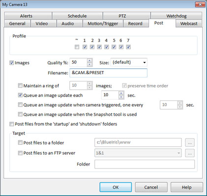 Ud. puede seleccionar en qué combinación de Perfiles (Profiles) se efecturará la publicación. Un perfil particular está activo en un momento dado según esté especificado en la página de la Programación global (global Schedule), o, si Ud. lo prefiere, en la página de la propia Programación (Schedule) de la cámara. También hay botones de perfil en la parte superior de la ventana de Blue Iris que mostrarán qué perfil está ahora activo. Si Ud. pulsa alguno de ellos, se ignorará tanto la agenda global, como la individual de todas las cámaras, Si lo pulsa una vez, se forzará temporalmente ese perfil. Si lo pulsa dos veces, se quedará de manera indefinida. La casilla ~ le permite elegir si se publicarán o no imágenes estando la cámara inactiva (es decir, sin perfil activo).