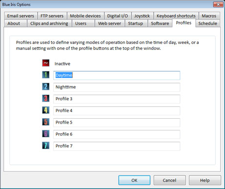 Los perfiles se usan para definir diferentes modos de funcionamiento dependiendo de la hora del día o del día de la semana; también se pueden seleccionar a mano con uno de los botones de perfil de la parte superior de la ventana. Encontrará los perfiles mencionados en diversas partes del programa relativas a configurar agendas, alertas, grabaciones y otras características.