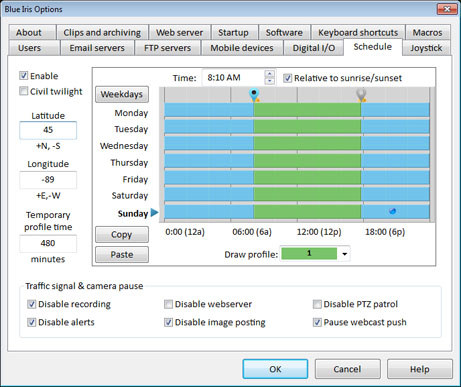 Cuando una cámara está inactiva, no habrá grabaciones, alertas o subidas de imágenes. Por otro lado, se puede definir qué efecto tiene un determinado perfil en cada cámara.En la pestaña de cada cámara de propiedades de Grabación (Record), Ud. puede seleccionar qué tipos de grabaciones ocurren durante cada perfil. En la pestaña de la cámara de propiedades de Movimiento/Disparo (Motion/triggers), Ud. puede asignar una sensibilidad diferente, una máscara o poner una marca (flag) que forzará la grabación continuada. En la pestaña de Alertas (Alerts) de las propiedades de cada cámara, Ud. puede decidir qué alertas serán enviadas cuando se active cada perfil.