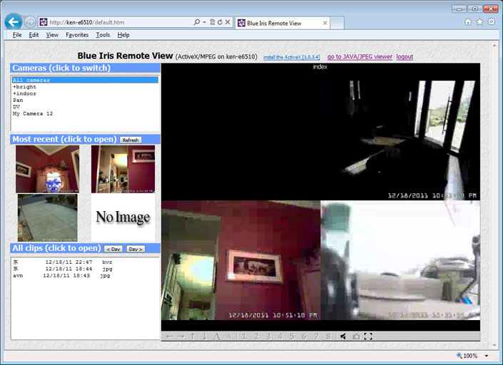 La página de inicio que está instalada con Blue Iris (que se llama default.htm) contiene una ventana para vídeo en directo y otra con miniaturas de los últimos cuatro clips. También hay opciones para cambiar de cámara en configuraciones multi-cámara, y para abrir cualquier otro clip de la lista de clips (clip list). Esta funcionalidad sólo está operativa con el control ActiveX en Internet Explorer. Otros navegadores abrirán páginas web basadas en JAVA, como jpegpush.htm o jpegpull.htm.