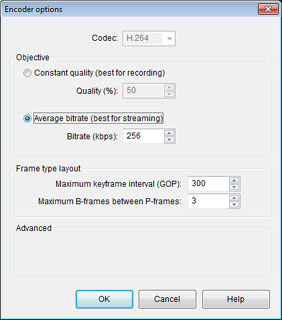El objetivo (objective) de codificación H.264 puede ser Calidad constante (Constant quality) (Usado normalmente para grabación. Utiliza una tasa variable de bits, VBR) o Tasa de bits promediada (Average bitrate) (Usada para limitar el ancho de banda usado en la conexión de red). Un ajuste de calidad del 100% se considera "sin pérdidas" ("lossless") pero usará una cantidad enorme de ancho de banda.