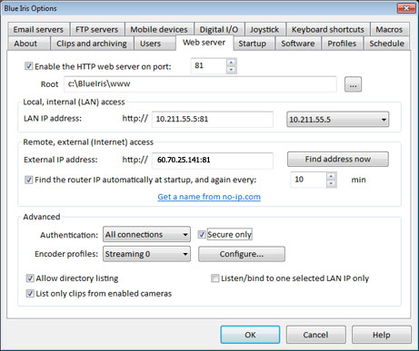 The Web Server now distinguishes between LAN connections and Internet connections. When a user on the LAN connects to the server, the Blue Iris LAN address is used on web pages instead of the external IP or hostname. This fixes an issue where PCs on the LAN are incapable of properly resolving your router's external IP address.